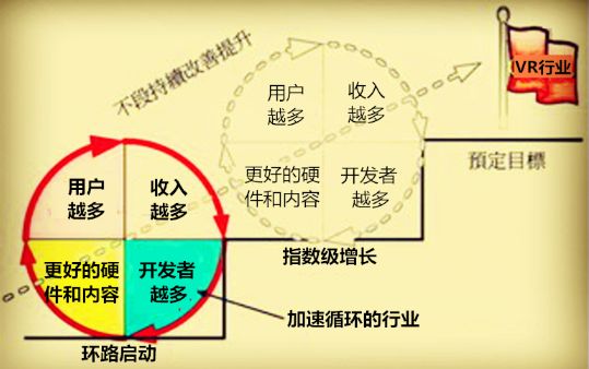 这样分析下来,我们就要做到这三点:第一,硬件的体验好一倍,价格降低一倍,内容丰富十倍。如果能做到这三点,我们就可以成功地把环路彻底打通,一旦这个环路循环起来,资本、媒体、广告就都会追捧VR行业,这个环路是第一性原理。