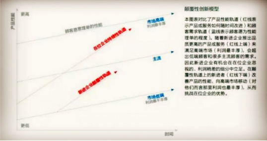克里斯坦森在《创新者的窘境》中说到两个“价值网”的概念,即“技术(供给)和市场(需求)组成的价值网“,任何一家企业,当它进入一个发展轨道后,真正决定企业未来发展方向的就是市场价值网;一方面,你需要发展核心业务,促进现有的S型曲线发展到极致,另一方面,就是未雨绸缪,开发并带领组织开始新的价值网曲线,是谓“颠覆式创新“:所谓“颠覆式创新“,通常是以“低端颠覆、边缘创新”的方式展开,也就是从先满足市场非主流需求开始。
