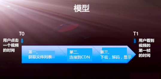把“用户点击一个视频的时间”定义为T0,“用户看到视频的第一桢的时间”定义为T1,把T1-T0的时间完整分解。那么,这中间经历了什么步骤呢?第一,获取文件列表;第二,连接到CDN;第三,下载,解码,显示。