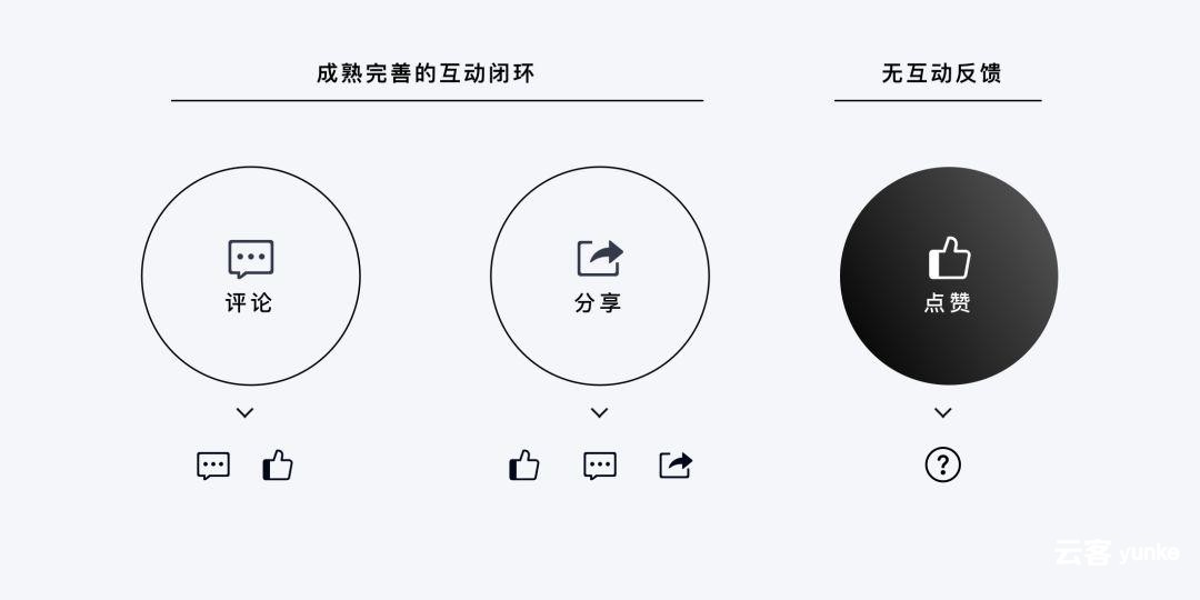 显然,我们应该把围绕点赞行为的关键行为路径作为主要互动场景。并且所有对于点赞的反馈都是直接依附于点赞行为本身的,使反馈行为具有明确的指向性。