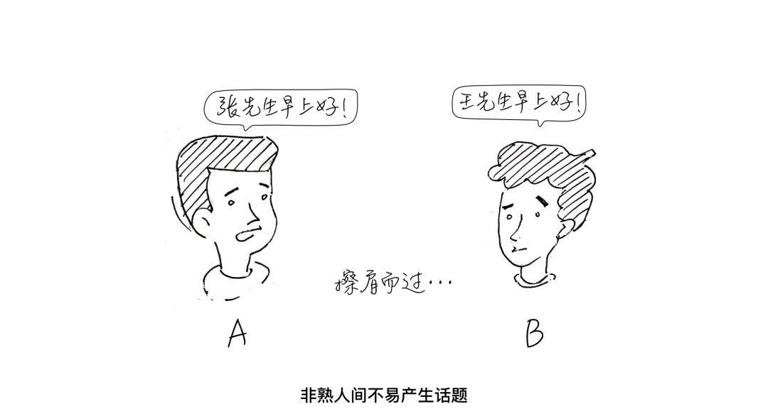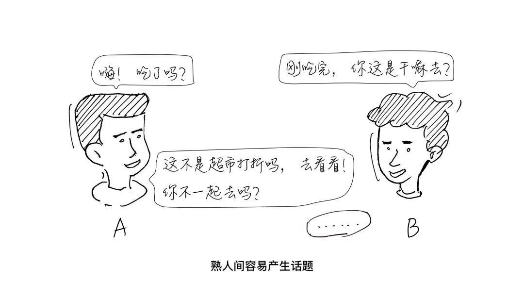这是一个很常见的熟人互动案例。我们可以看到,熟人间很容易产生话题,并持续互动下去。但是如果同样的话题发生在不是很熟悉的人之间,可能就会是另一番场景: