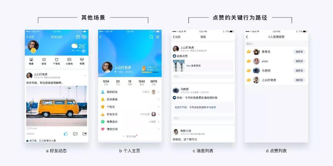 根据用户的行为目的,我们可以把以上场景分为两类:围绕点赞行为的关键行为路径(图c.消息列表、图d.点赞列表)、不以点赞为核心目标的其他场景(图a.好友动态、图b.个人主页)。