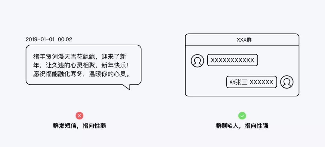 在互动的过程中,指向性不明确的互动行为是低质量的,不容易获得进一步的反馈。例如评论区中的统一回复、群发的新年问候、领导在台上的讲话等。