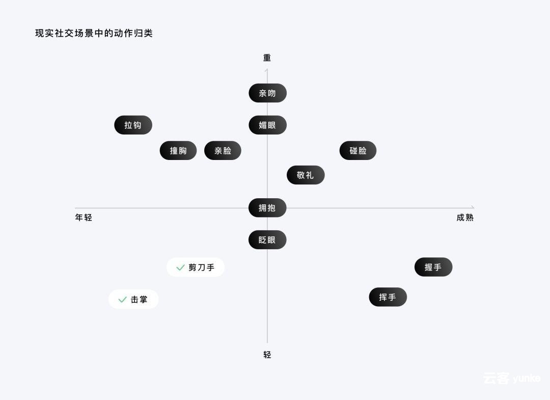 关于点赞反馈行为的语义表达,我们列举了很多来自现实社交场景中的备选方案,然后以动作的情感程度和成熟程度划分了4个象限,对这系列动作进行归类。