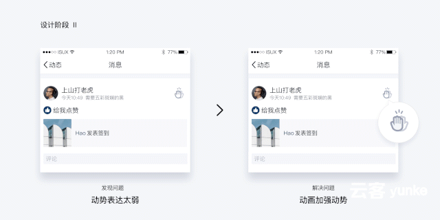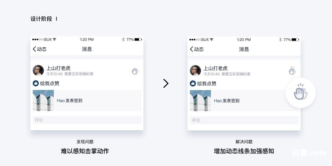 在击掌功能的设计过程中,我们不断在发现问题、解决问题的循环中不断寻求更优解,逐步把一个不到100像素范围内的击掌icon做到更好,以此来唤起用户的对现实击掌的记忆,建立起与用户情感上的连接。