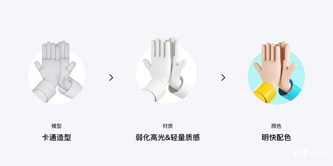如前文所述,对于击掌反馈行为是一个轻量化的互动,为避免3D表现手法过于写实而带来不必要的厚重感,同时也为了增加动画的趣味性,我们选择卡通的手掌造型进行建模。