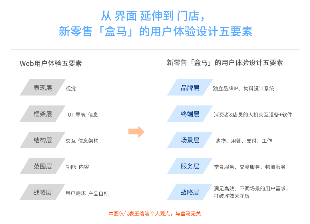 本文作者参照Web用户体验五要素模型,并结合新零售场景的多样性,去分析盒马用户体验设计的5要素,看看盒马设计师在面对新零售场景时,是如何思考和开展体验设计的。