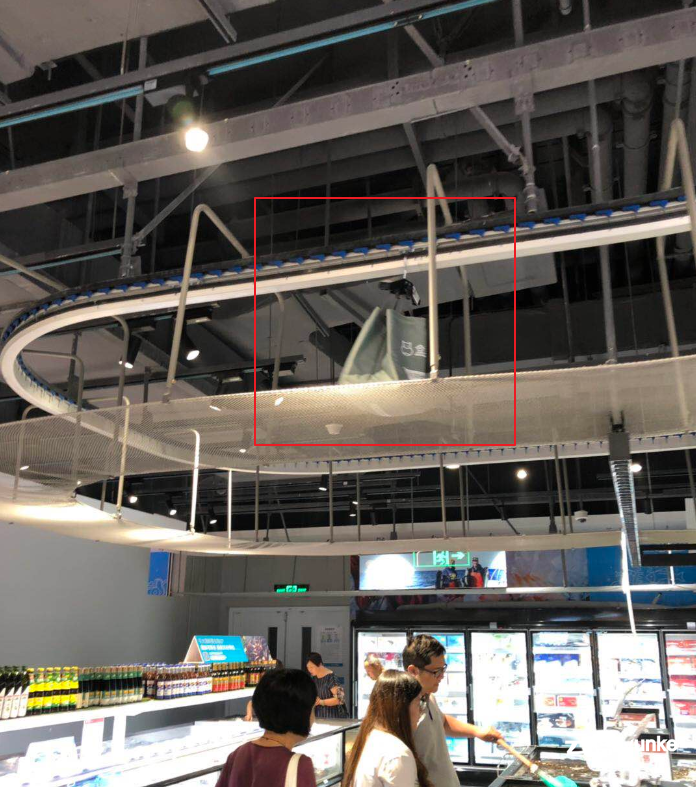盒马鲜生门店的天花板上有个“传送带”,各个商品区域都有一些拿着拣货机的店员对照订单拣货。店员把商品捡好、装在袋子里后,挂在悬挂链上,我猜是传送到后场配送区直接配送。