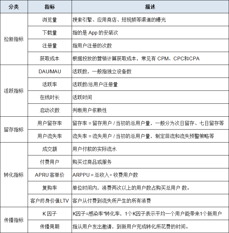 当用户处于不同的用户生命周期不同阶段时,也需要使用不同的指标去定义。根据海盗模型 AARRR 产品增长模型,可以将指标分为五大类:拉新指标、活跃指标、留存指标、转化指标、传播指标。