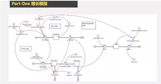 图示是一个比较基础的增长模型,三个回路连在一起,每个都有相对应的节点。可以在假设市场费用剥离的情况下,通过看公司自我增长情况,来验证产品结构和商业模式是否成立。