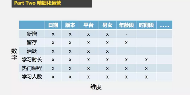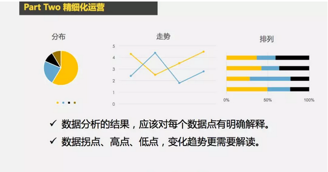 追求数据的准确和完善,并且进行准确的对比分析和解读,是一项持续不断的工作。当你的数据开始逐渐减弱对工作指导性的时候,就说明你进一步的精细分析又要开始,就要再增加维度,精细化运营也是数据运营逐渐深化的过程。