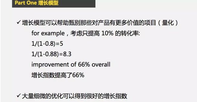 - 找到对转化增长最有帮助的需求,优先处理这个环节。之前我们考虑性价比和成本,有些技术觉得这个需求简单,很容易就完成了,那个需求很简单也先做掉。这样虽然把问题处理掉了,但其实这三四个小问题对增长的帮助非常小。