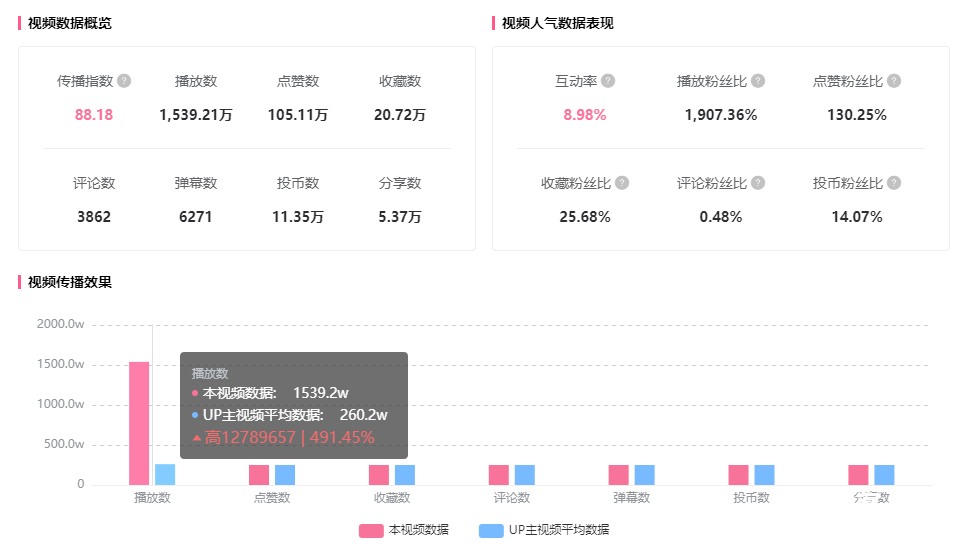 作品发布截至目前不仅登上了**一期的【每周必看】,更是揽收了高达1539.2w的播放量,互动数据中点赞数更是超过百万,点赞粉丝比翻了一倍还多,作品的传播水平远超UP主平均水平。