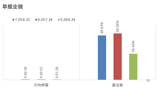 此外,对内容赋能型产品较重要的指标之一,每日早报的分享回流比,6-8月数据呈倒U型,可见该功能模块的分享数据并不稳定;而退出率的升高,也反映每日早报模块对用户的吸引力有所减弱。