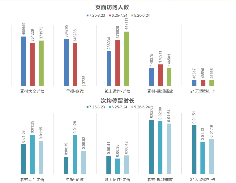 将话题素材,营销工具,每日早报,社群运作几个模块的用户访问量,用户停留时长做了近3月数据对比:可以看到,6-8月,每日早报的页面访问人数大幅增加,对应次均停留时长却大幅下降,初步判定每日早报的内容吸引力有所下降。