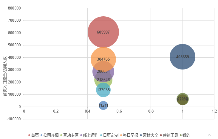 为了解各个模块的访问人群数占比,将小程序首页的几个主要入口做了简要流量对比,大致的流量图示意如下,除了素材大全,每日早报、线上运作的流量占比都很高,故先从这几个功能的数据入口,寻求优化优化点。