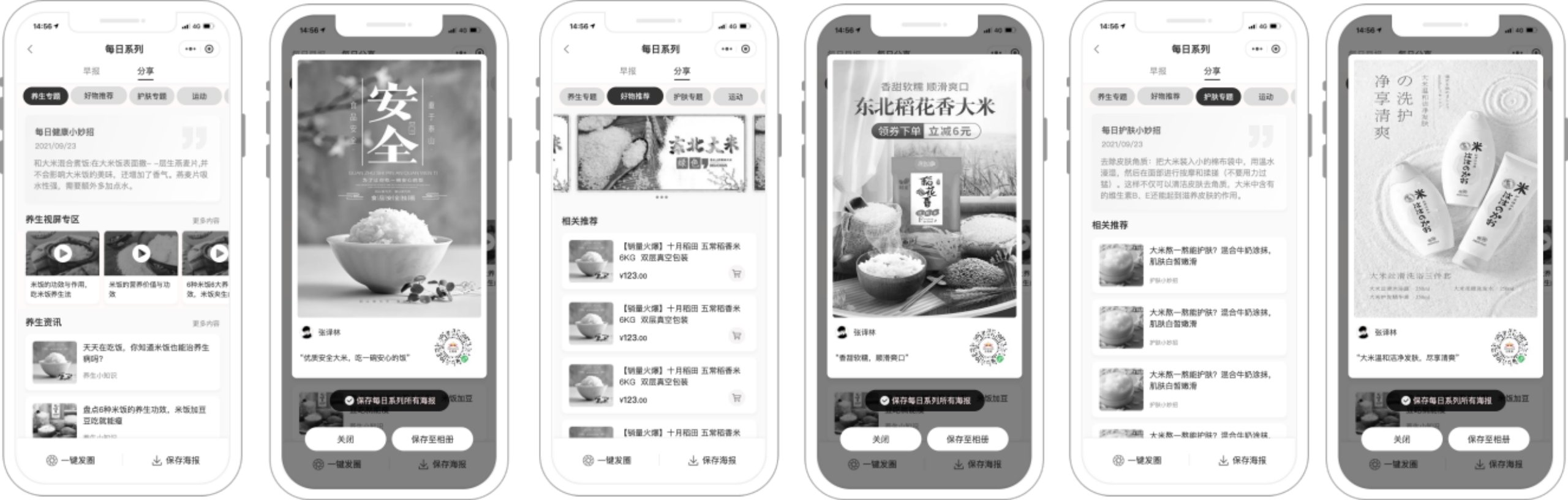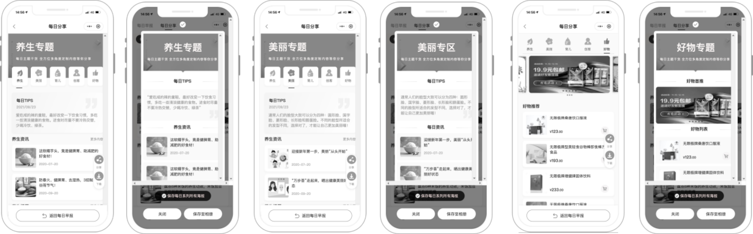 第二个模块为每日分享,作为新增的系列,以养生专题/护肤专题/运动专题/好物推荐为维度增加系列内容,供用户转发主题干货/新品推荐/系列视频等内容,较方案二内容层次更多元,更丰富。