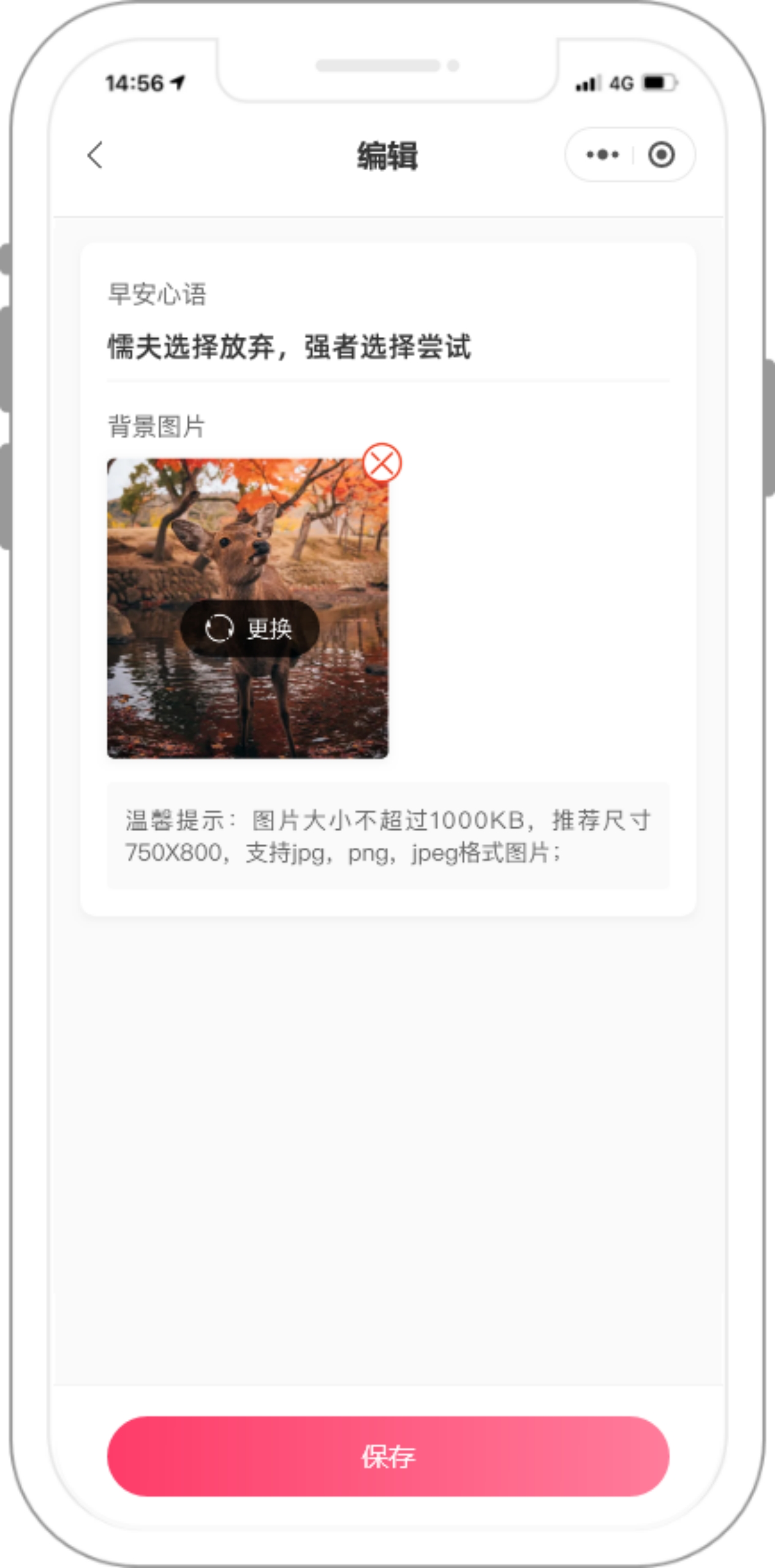 如1张主图和1句励志心语改为支持用户自定义,当用户不做另外修改时,可下载默认的主图和心语内容,当用户有自己的偏好内容时,可自行更替。