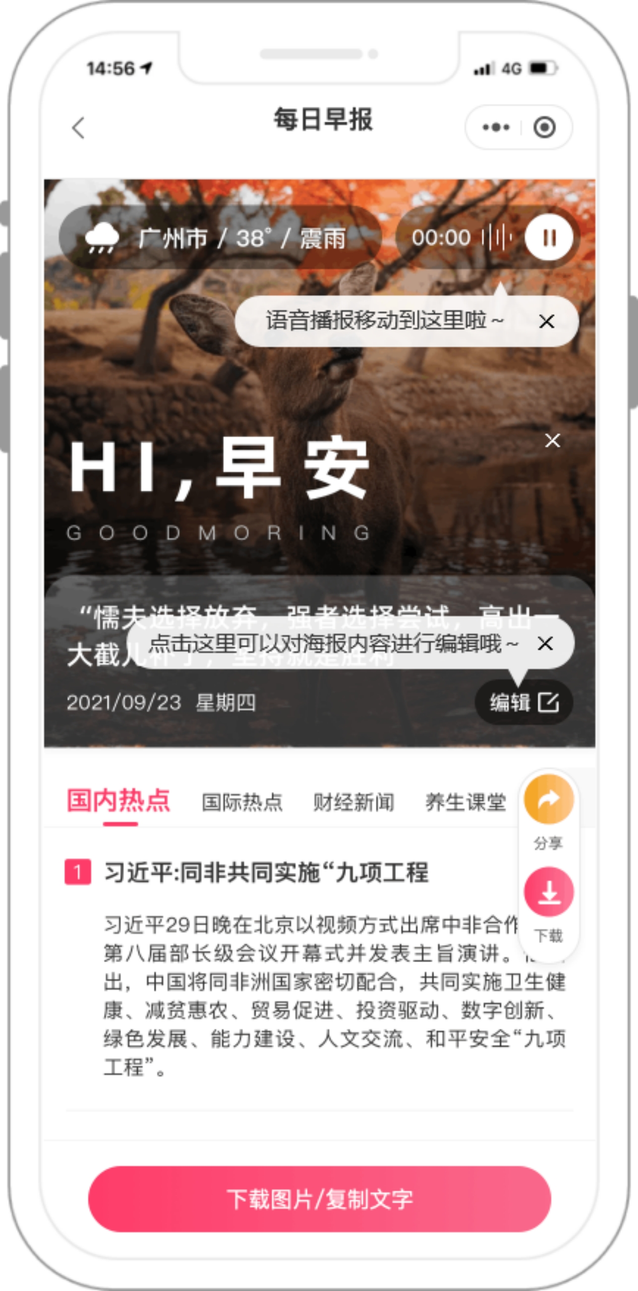 可以发现,话题素材是最主要的内容呈现形式,整个产品的话题素材和文案内容都支持一键复制和下载功能,将转发内容的前置环节大大缩短,对于中青年、中老年用户来说是非常便捷的。