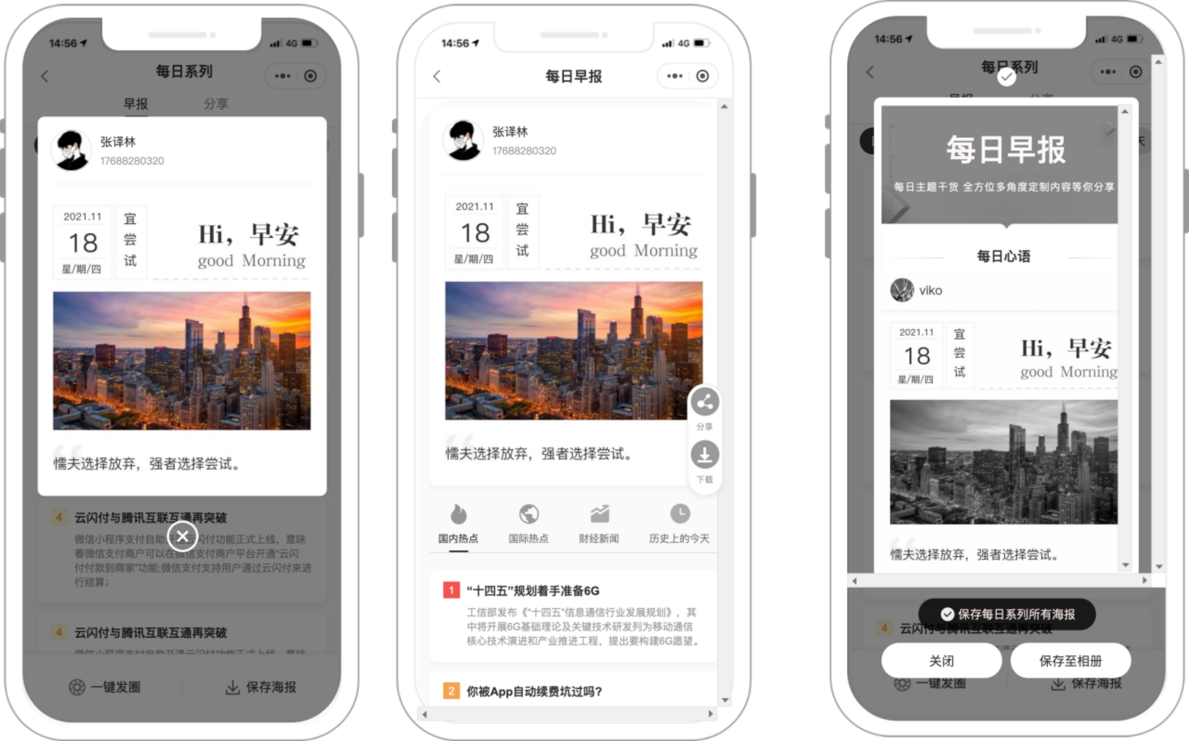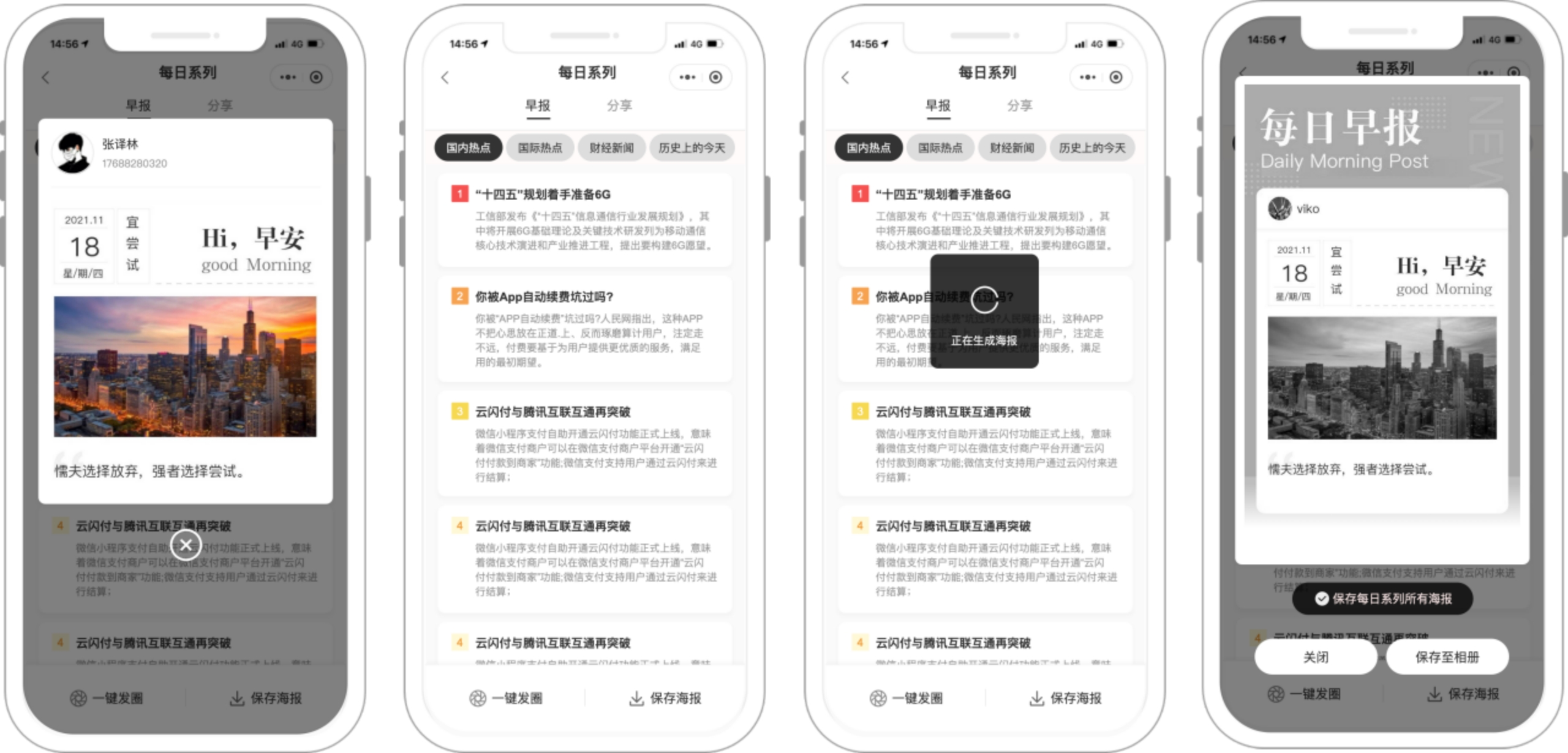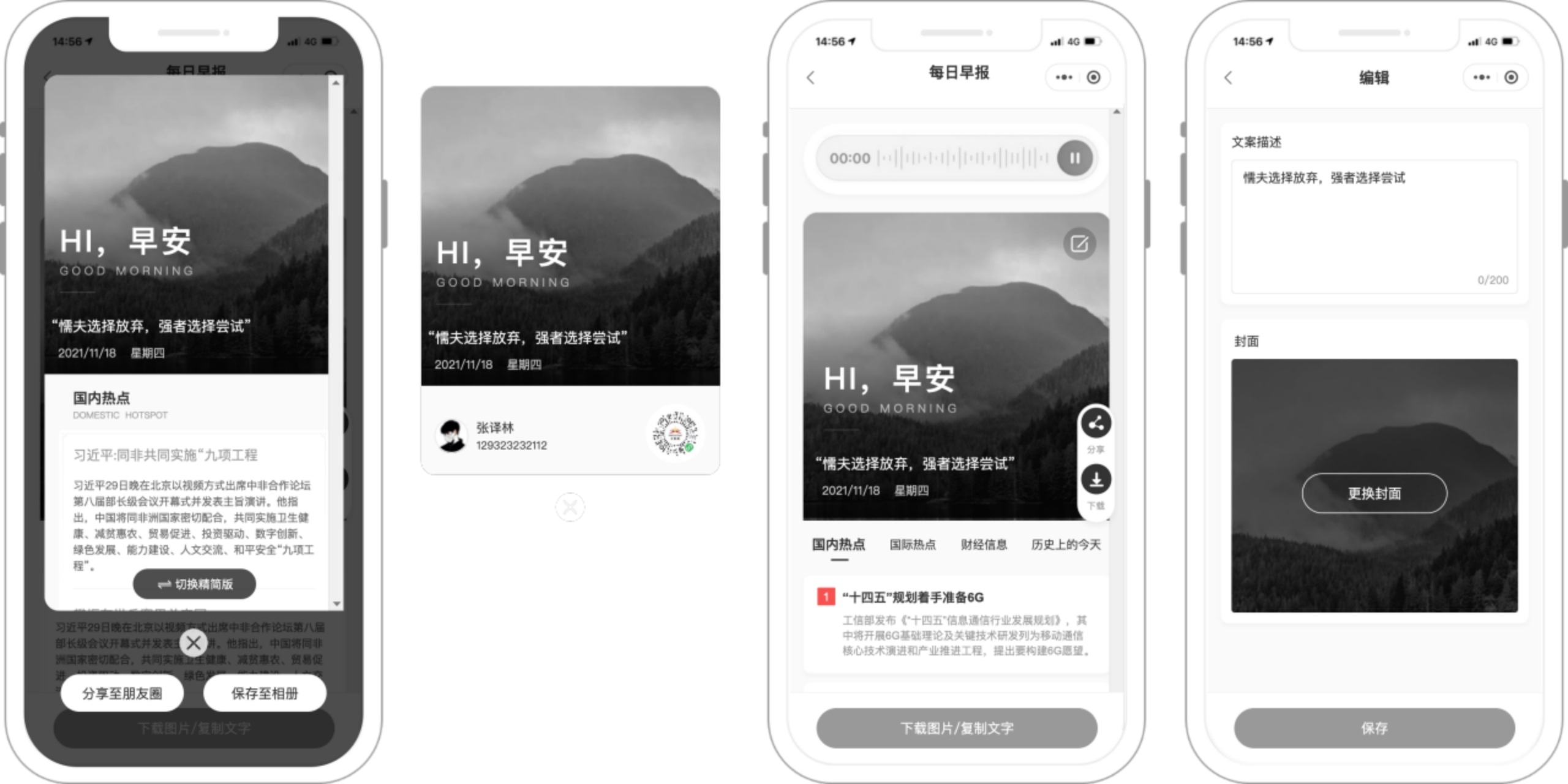 因此在结合调研的基础上,砍掉每日分享模块,新增自定义每日心语功能,且支持一键下载所有海报,切换精简版/完整版早报功能。