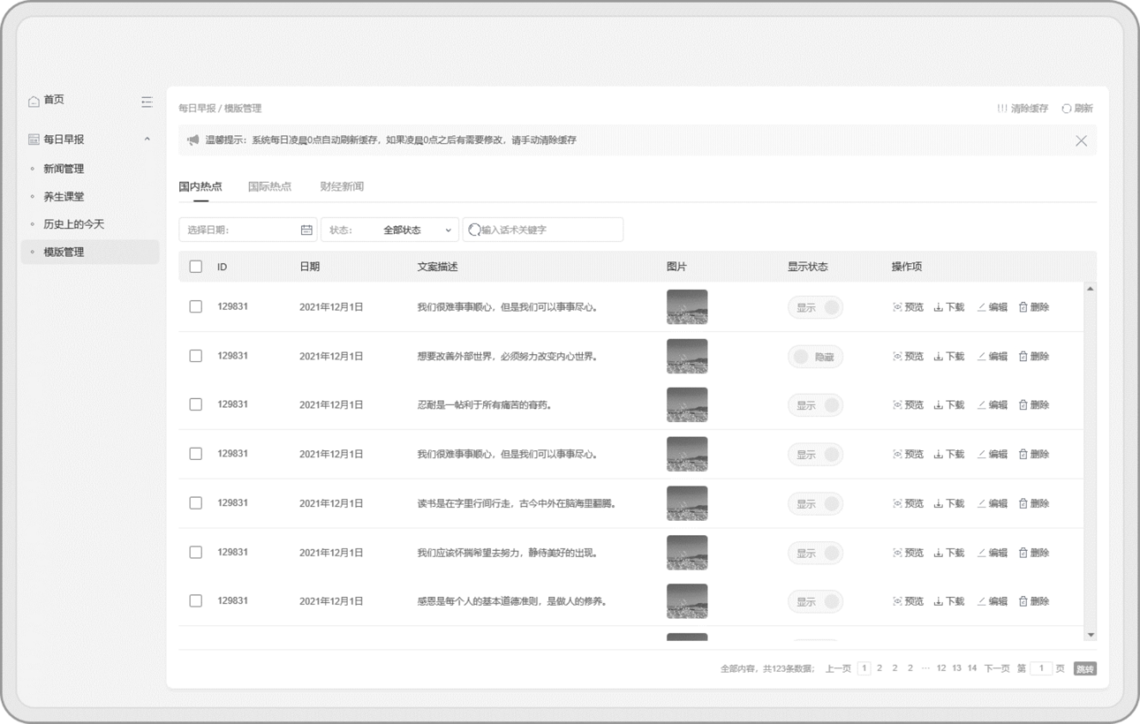 在内容配置上,支持增加其他系列海报,如每日食材,每日好物,每日养生等。通过后台配置可自由新增海报模板,将海报的图片样式,文案内容,日期信息等做成独立组件,大大增强了每日早报系列的扩展性。
