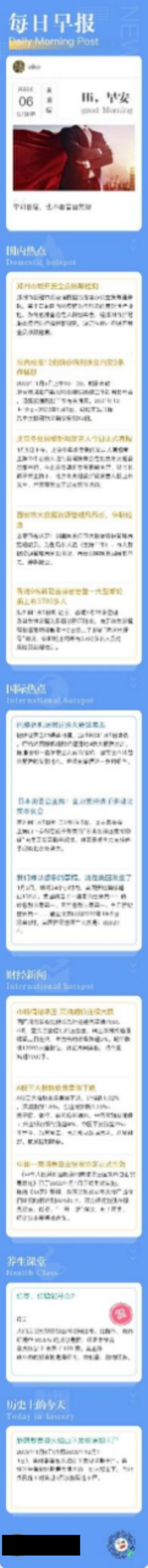 旧版的早报资讯模块,只能浏览前5行,最多每条100字的新闻内容,虽然能够满足客户的浏览新闻概要需求,但对于转发用户而言,内容深度有一定程度的缺失。因此新版的早报,在页面上可通过新增板块,呈现更多新闻分类,且每一个新闻分类下的资讯内容的条数都不做限制,可通过后台配置随意增减。
