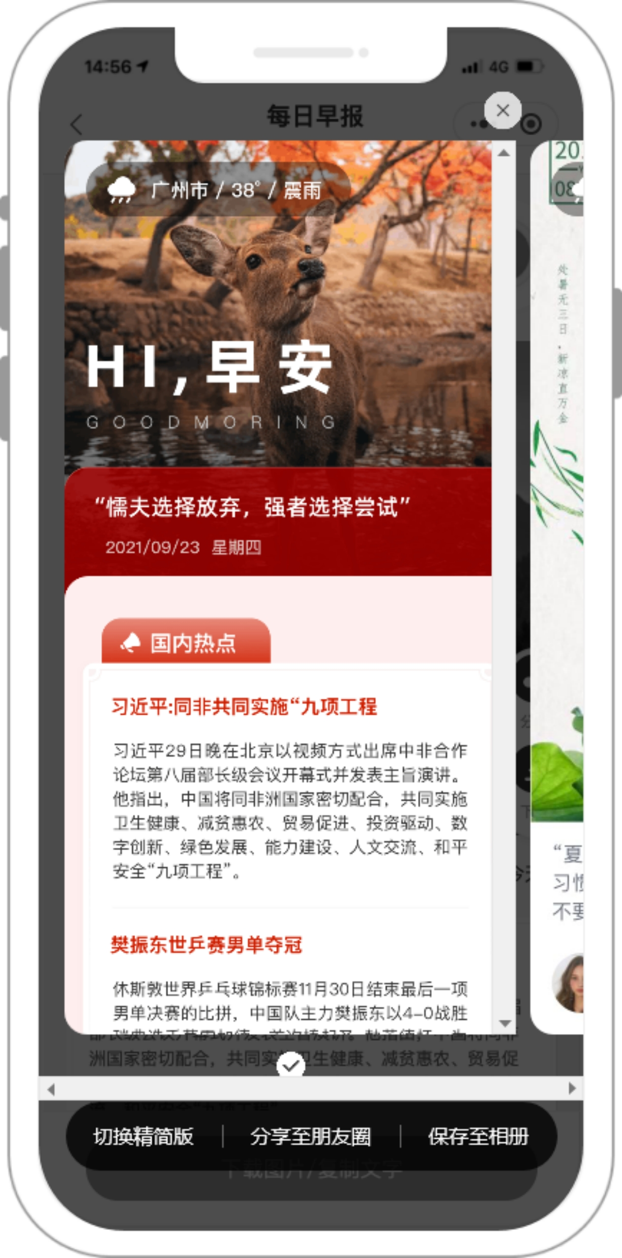 此外,参考市面主流的每日系列功能,新增精简版海报样式,只展示1张主图和1句励志心语的简要版海报,通过tab切换按钮提示用户进行详细版和精简版的切换,满足用户分享精简海报的需求。