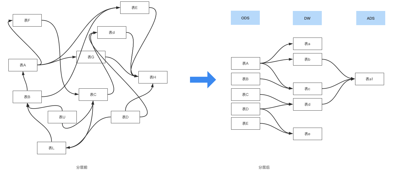 上面两个图可以很清晰的看出分层后的好处,把一团乱麻的数据表进行分层和整理。数仓分层的价值在于: