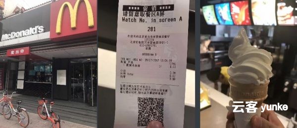 这个活动帮助三个城市的麦当劳通过四天的时间发出去有20万支甜桶,这个20万支指得是真正拿着这个兑换的优惠券去店里吃到甜桶的用户。这张照片是我自己拍的,我们和同事在活动上线之后就骑车兑换,去公司附近的麦当劳吃甜桶。