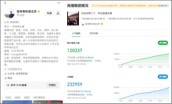 比如《私域流量池》作者刘翌老师发起了百日依靠视频号直播变现百万的活动,而在进行第22天之后累计变现达到115597元。再比如视频号“张导带你游北京”的一场讲解故宫文化的直播,累计开播5小时27分,共有12万人次涌进他的直播,点了近23.3万次赞。而张导作为一名资深导游,深谙北京的历史人文;其直播的爆发不是偶然,一是提前在3月31日到4月25日,进行了不少于12场带预告的直播,二是借助北京名胜古迹的大IP,三是在直播中认真做好内容。