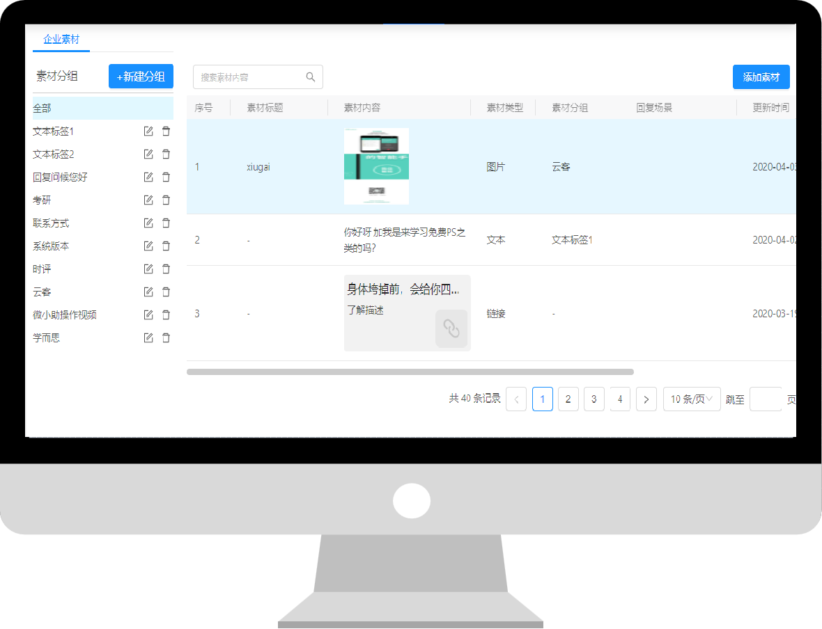 快捷回复:结合企业微信自有能力,支持按企业、部门、个人不同的角色创建快捷回复素材,支持文本、图片、视频、链接等类型,SOP中配置的沟通信息也可以自动导入到素材库中。然后员工在企业微信沟通的时候,右边栏会出现标准素材库,统一且高效的跟客户进行高质量沟通。